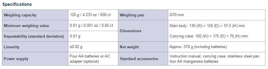 Unparalleled battery life of 500 hours (with alkaline batteries, backlight off) Hygienic and chemically resistant stainless steel (SUS304) weighing pan and protector plate High resolution of 0.01 g with excellent repeatability of 0.01 g (σ) Large LCD display (15 mm character height) with clear white backlight Stackable carrying case that economizes space for storage Security slot in the rear of the scale to accommodate an anti-theft lock Multiple weighing units: g, oz, ozt, ct, mom, dwt, grain, tola, tael, and Newton Auto-power off function to avoid wasting battery power Battery indicator that tells you the remaining battery level Tare function that offsets the weight of a container with just one key press Optional AC adapter available